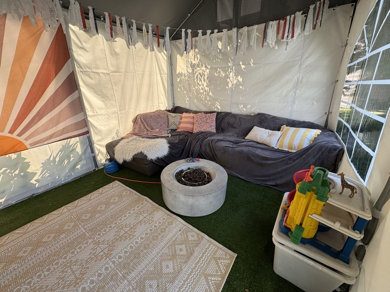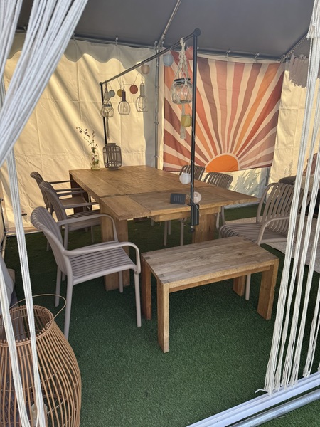 Buiten is er een loungebank, twee relax-tuinstoelen, een ligbedje met kussen, grote gas-barbecue, kinderstoeltjes, kinderpicknickbank, zandbakje, parasol, speeltoestel voor kleine kinderen, een grote bak vol speelgoed. We hebben een ruime tent met een eettafel voor circa 8 personen en een hele fijne chillbank (let op: gevaar voor in slaap vallen is groot ;) ). De tent is heel fijn omdat je ook met slechter weer lekker "buiten" kan genieten, ook is hier altijd schaduw bij de hele warme dagen en je kan in de avonden lekker lang blijven zitten (borrelen, spelletjes of zelfs slapen..). De tent heeft ook nog voldoende ruimte voor kinderen om lekker te spelen; er staat bijvoorbeeld een bak met een treinbaan waar onze kinderen graag mee spelen. Er zijn kinderfietsjes (1,5 - 6 jaar) en een step. Één volwassenfiets.